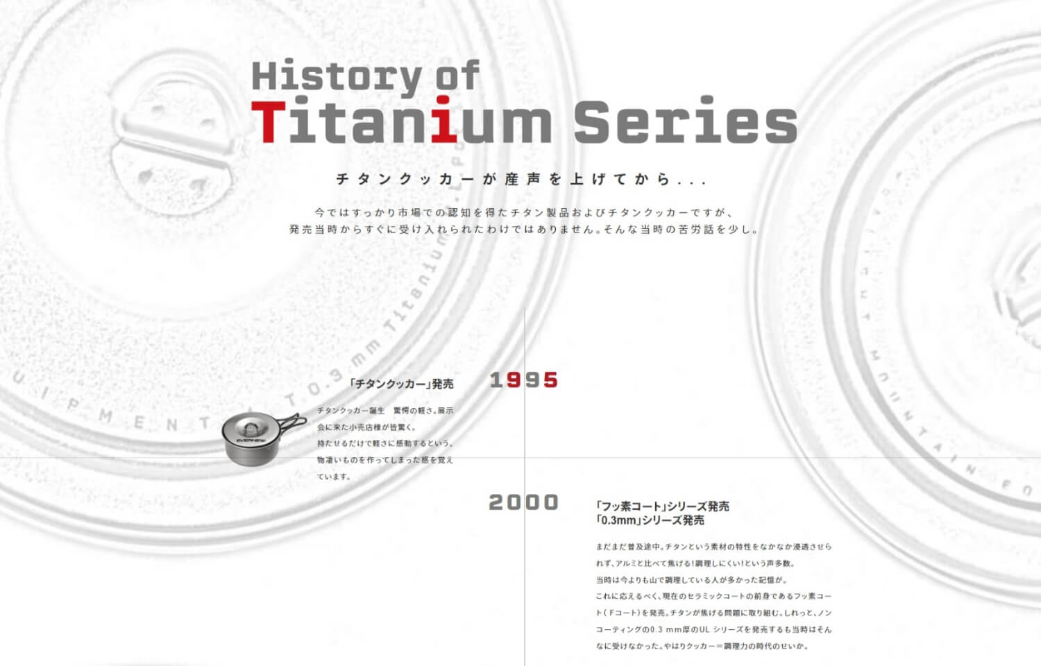 90年頃にチタンを素材として目を付け1993年頃から開発をスタートして94年の展示会で発表。95年に発売を開始。これが世界初の出来事で、「チタンで鍋を作る」という当時、誰もやったことがないこと行い、大先輩方が量産化にこぎつけたと聞いています。